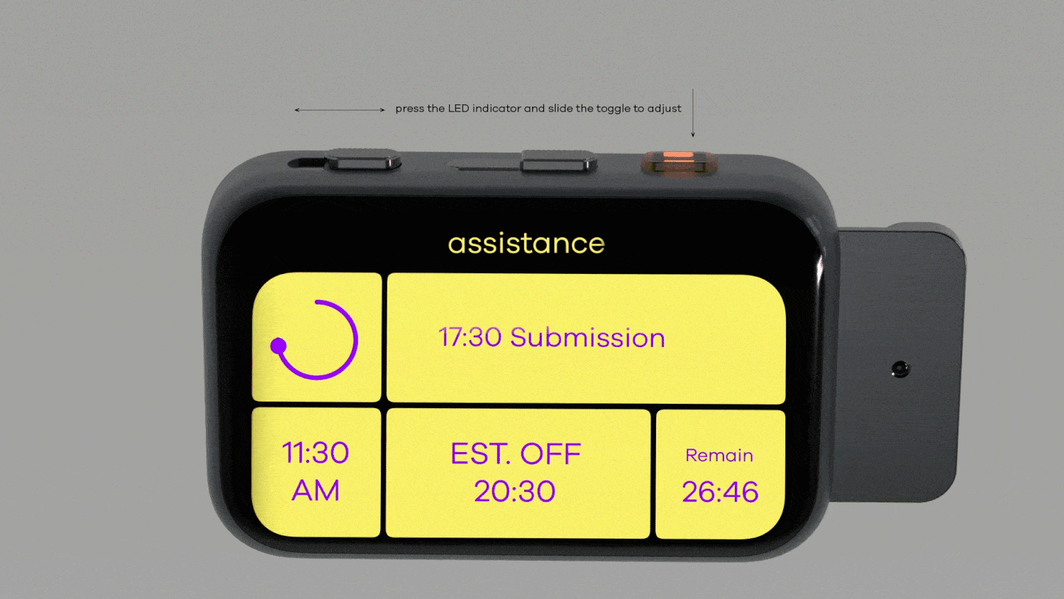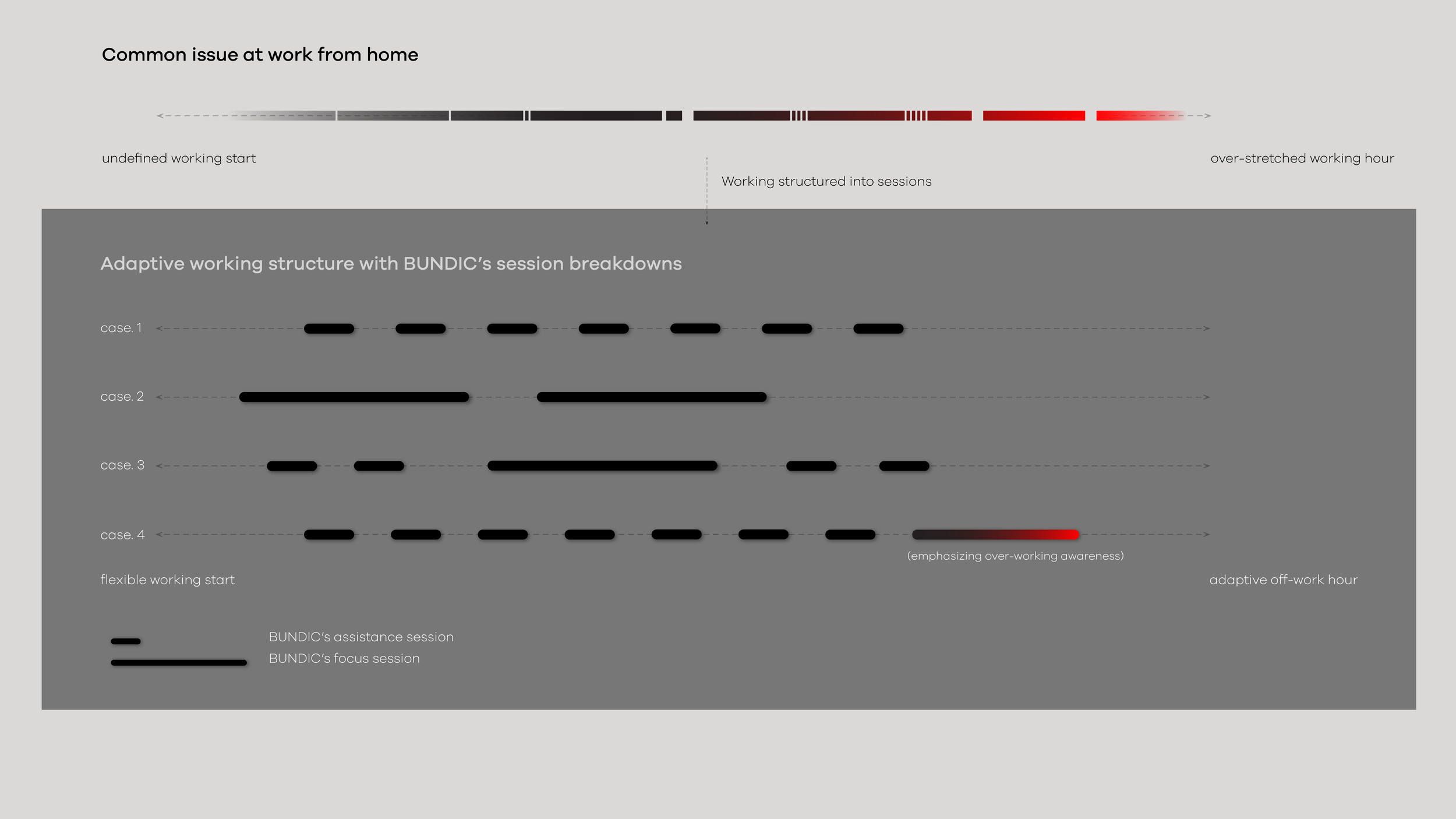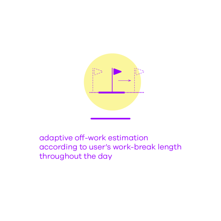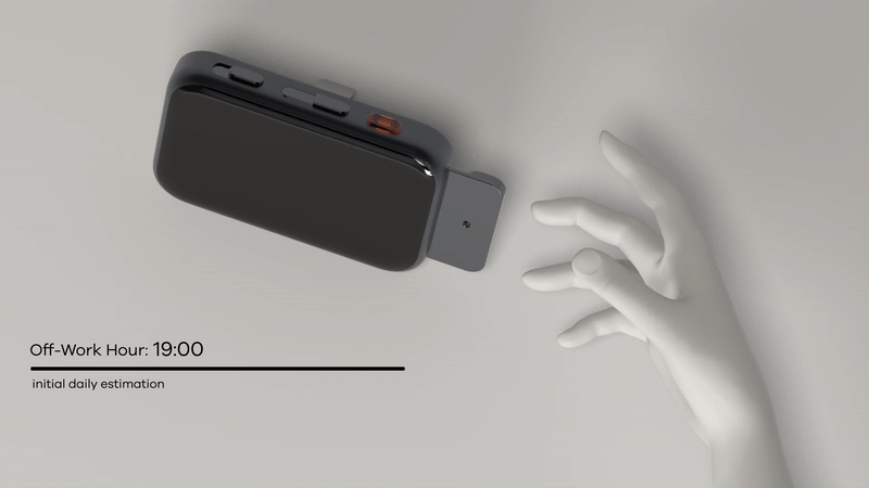Inspired by traditional working and the metronome that helps musicians focusing, BUNDIC tackles the blurry work-life boundary by a click-in and -out-action that creates an awareness of being working and provides an estimated time of their off-work hour by adapting worker’s daily work-break pattern.