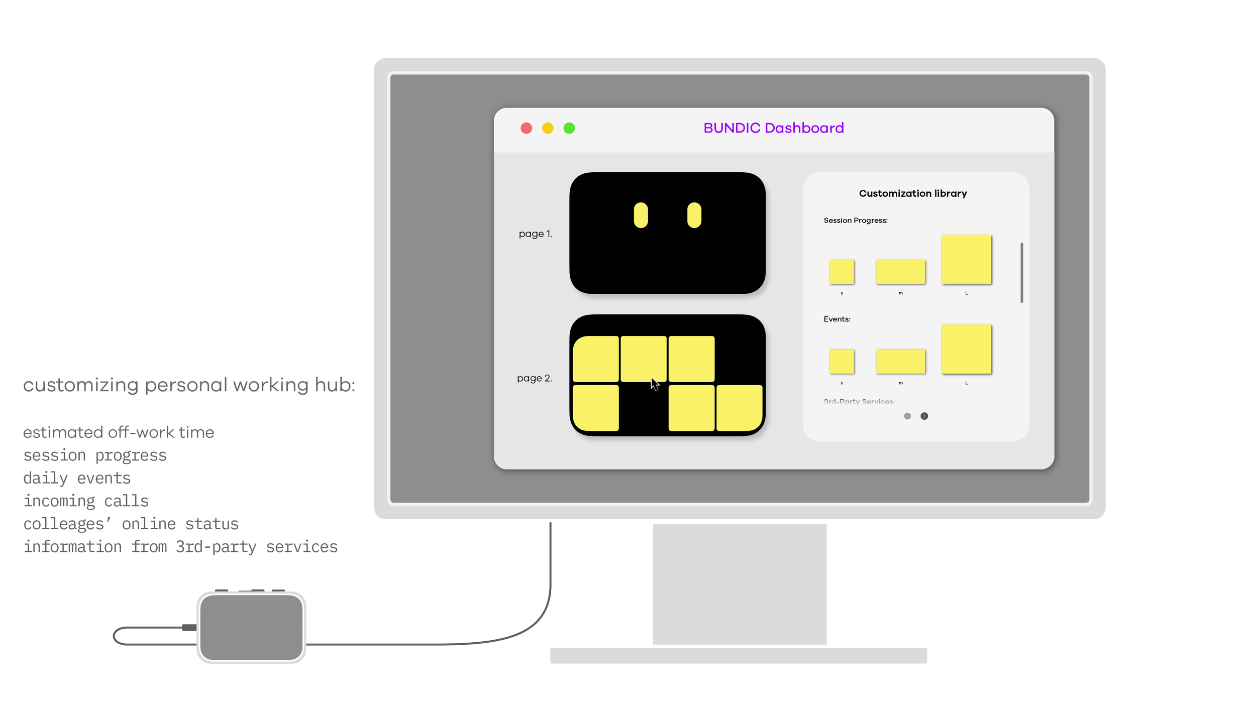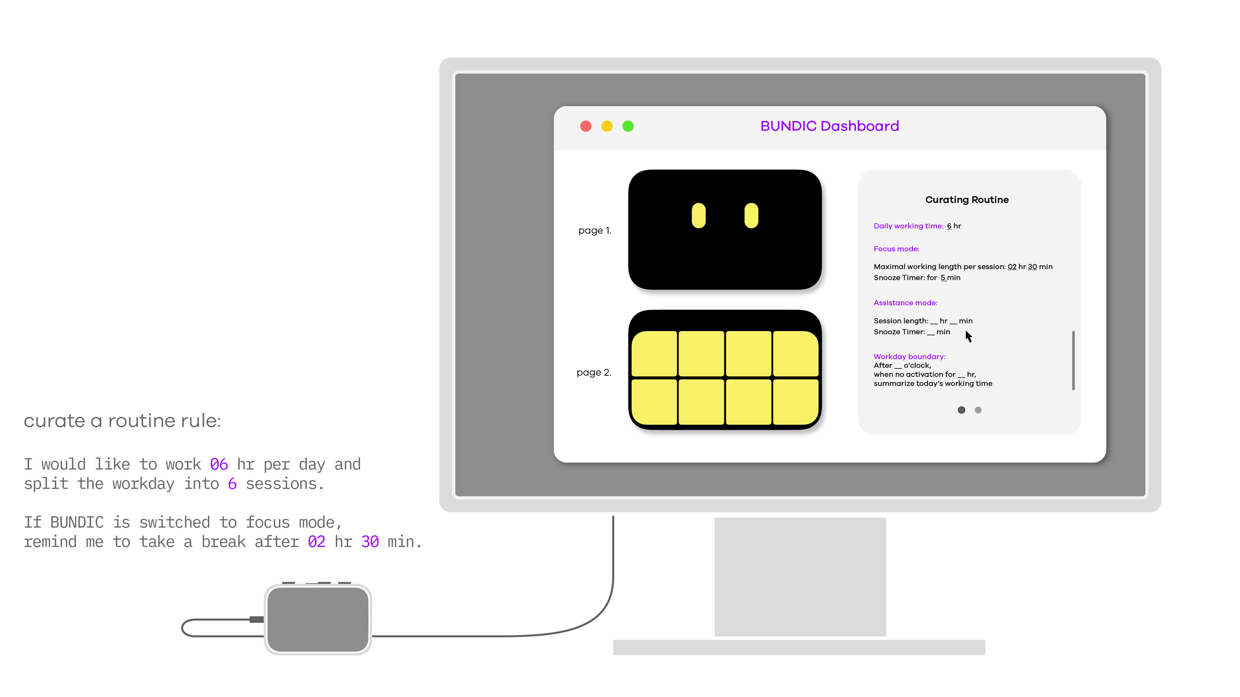 BUNDIC provides a series of simple physical interactions and indications that help users to create a working awareness for a more responsive routine when they work in casual spaces.